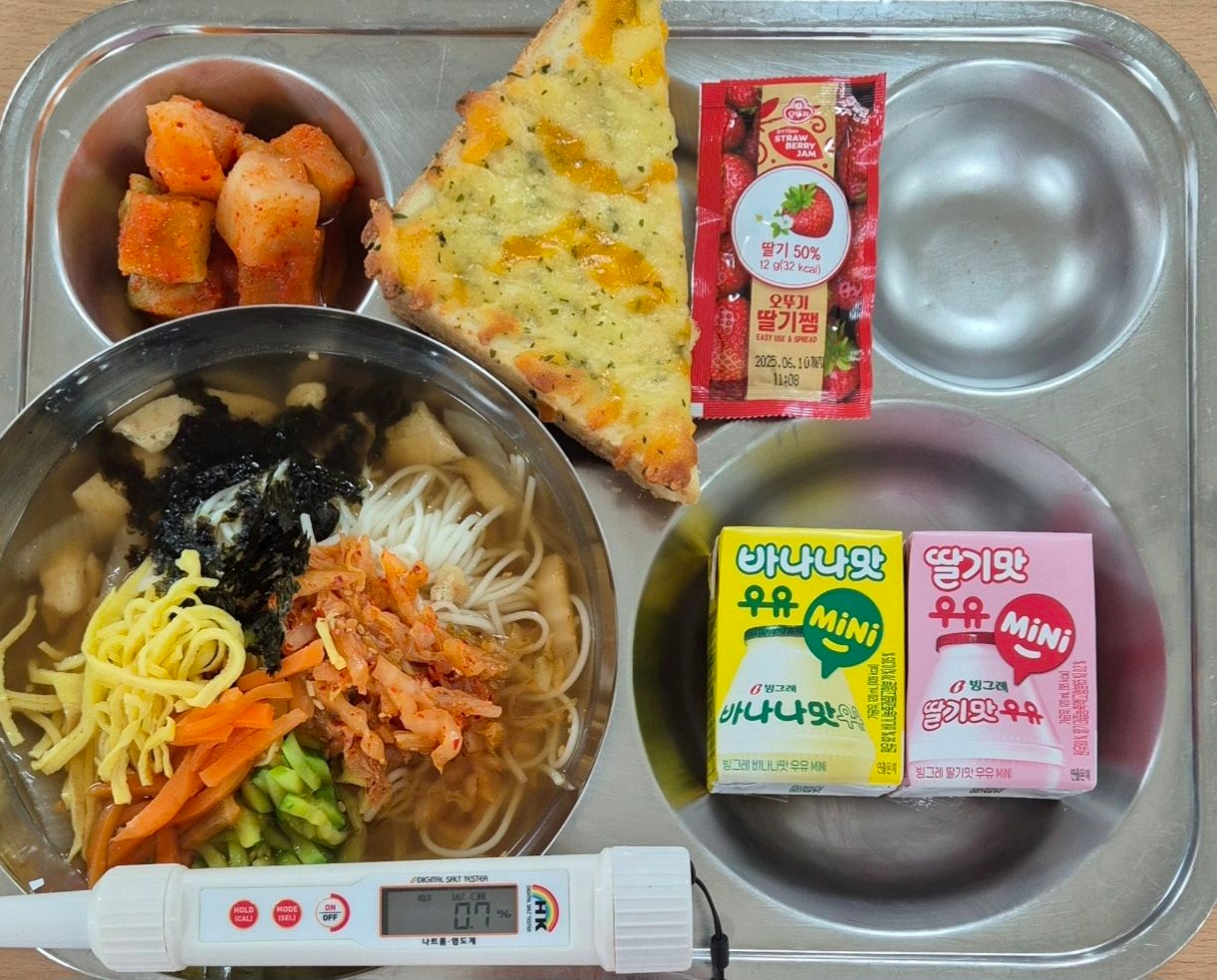 잔치국수(1.5.6.9)깍두기(9)크로크무슈(1.2.5.6.10.13)미니우유(딸기or바나나)(2)* 에너지/단백질/칼슘/철703.6/24.9/271.8/7.2