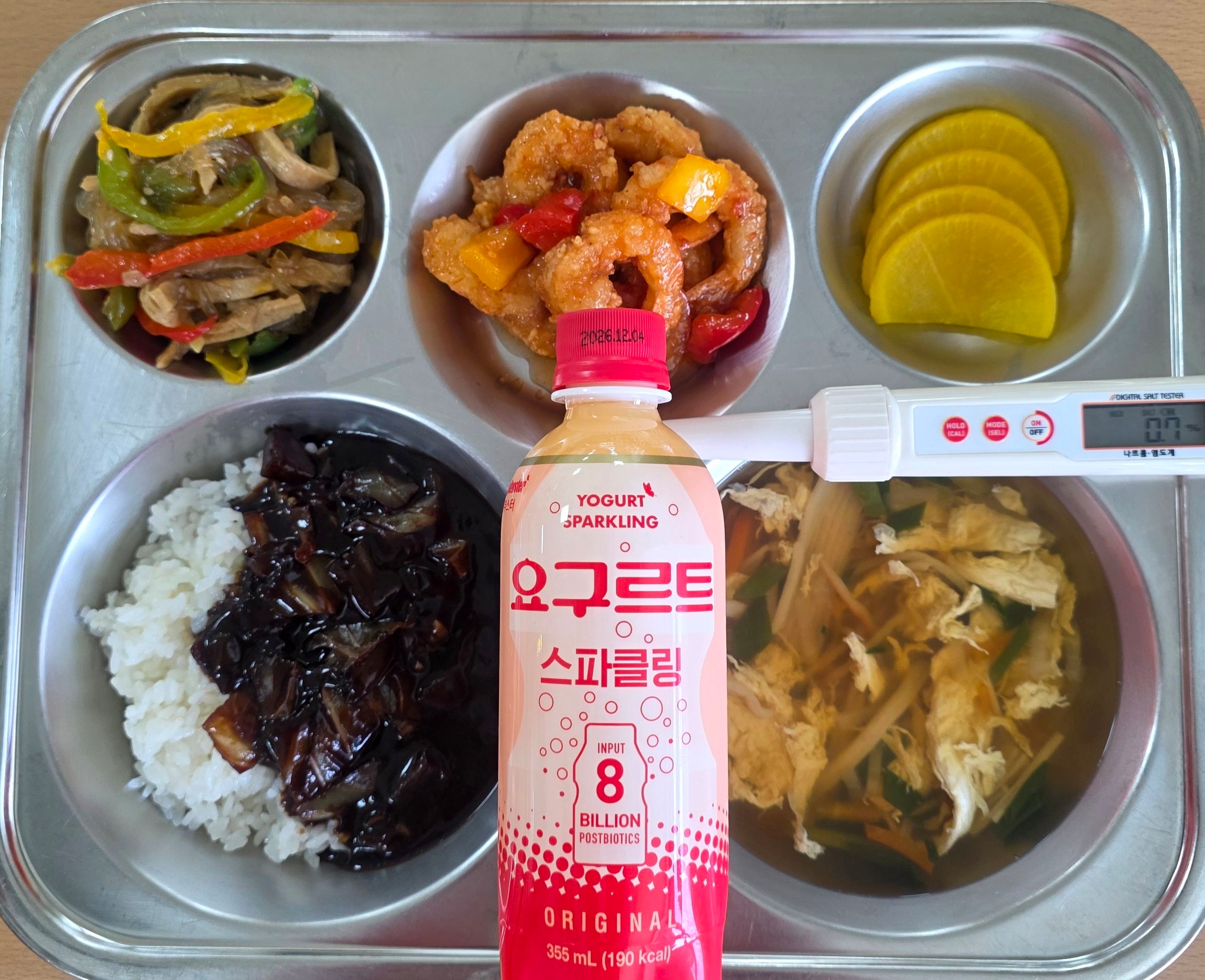 자장잡채밥(1.5.6.13.16)크래미계란국(1.5.6.8.9)칠리깐쇼새우(1.5.6.9.12.13)단무지요구르트스파크링(2)* 에너지/단백질/칼슘/철701.2/16.1/187.9/2.8