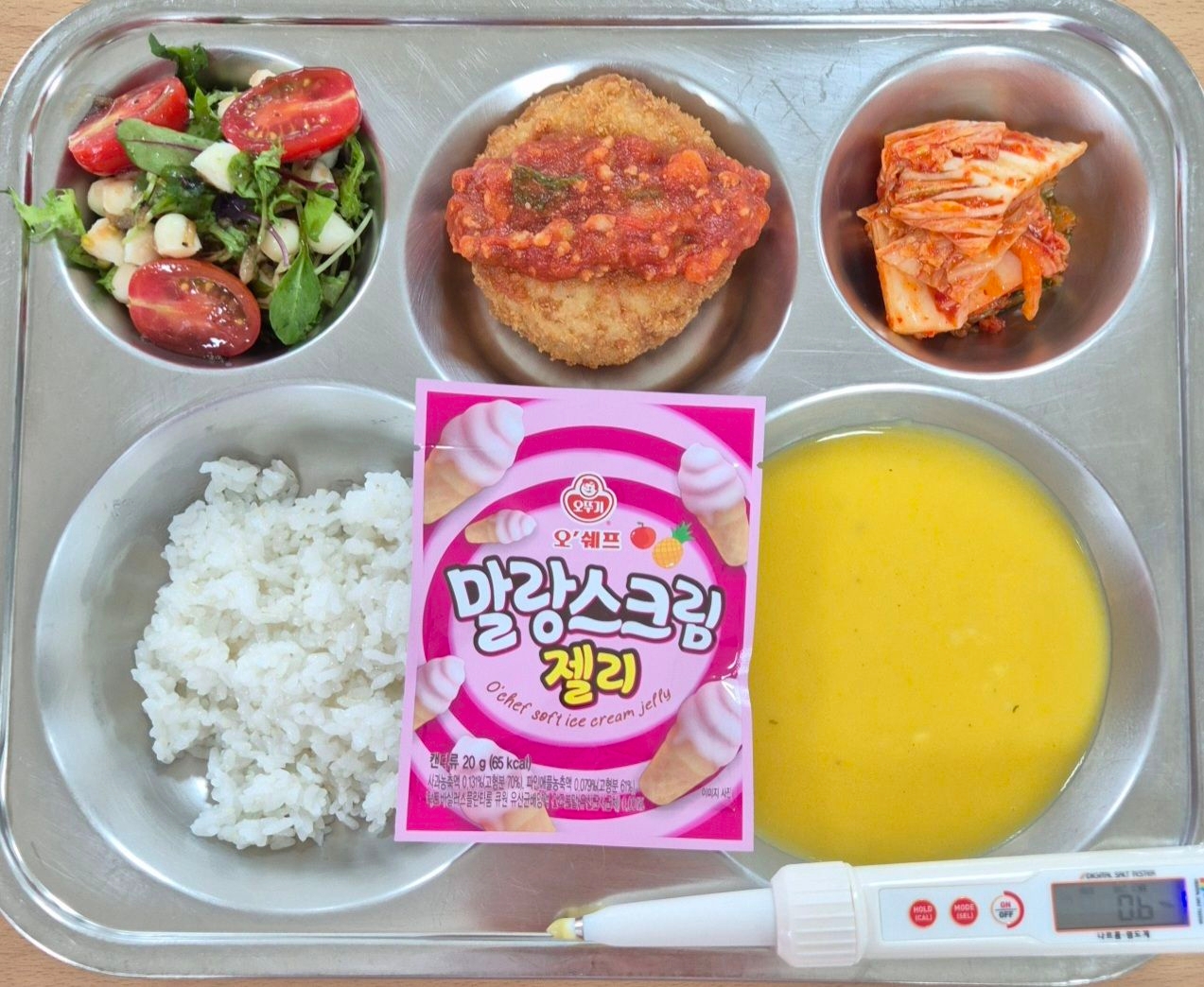 찹쌀밥단호박스프(2.5.6.13.16)피자돈가스(1.2.5.6.10.12.13)토마토치즈샐럿(1.2.5.6.12)배추김치(9)