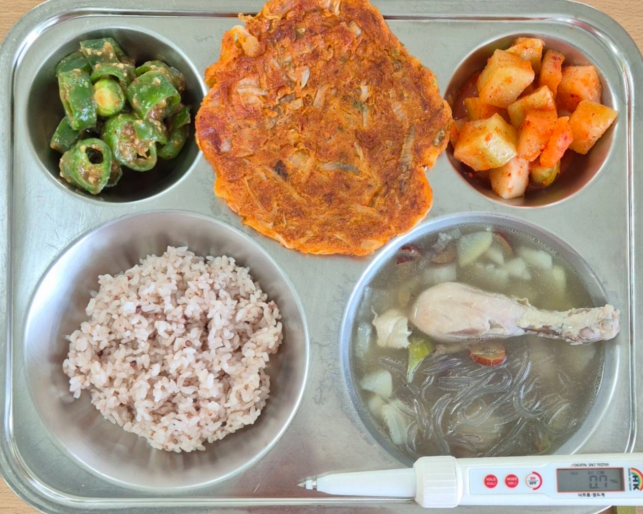 닭다리곰탕(15)김치전(5.6.9.16.18)아삭고추쌈장무침(5.6)깍두기(9)* 에너지/단백질/칼슘/철715.4/33.1/99.8/2.6