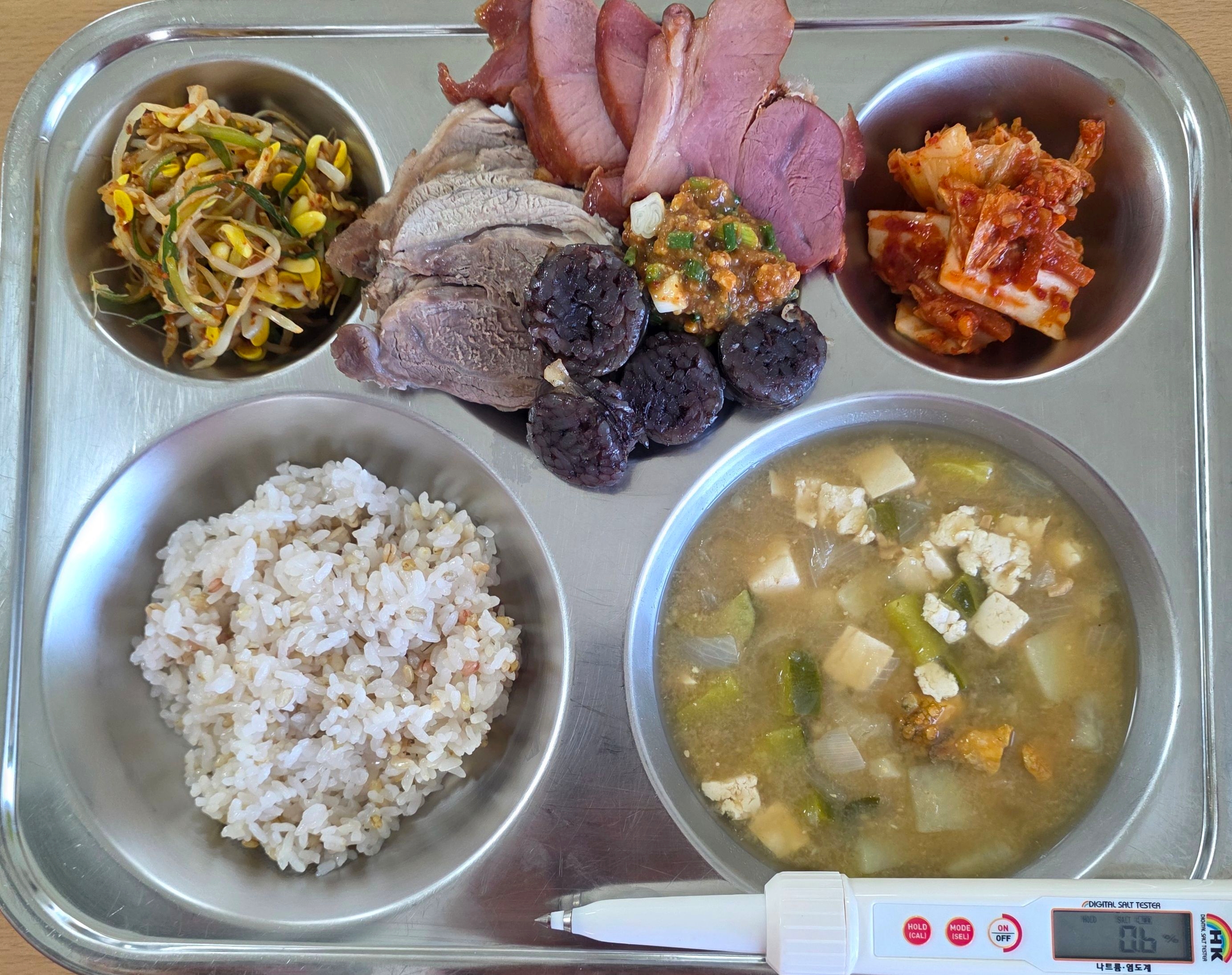 칠색보리밥미더덕된장국(5.6.9)모듬보쌈(2.5.6.10.13.16)/저염쌈장(4.5.6)콩나물파채무침(5.6)배추김치(9)* 에너지/단백질/칼슘/철748.7/42.5/138.9/5.1