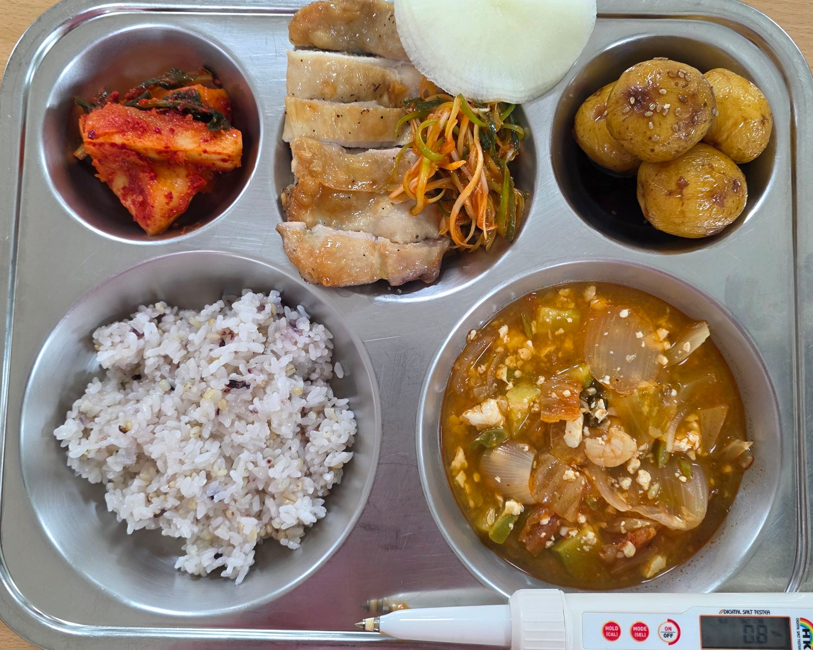 혼합잡곡밥(5)순두부찌개(5.6.9.13.16)닭보쌈/파채무침/무쌈(15)알감자조림(5.6.13)알타리김치(9)* 에너지/단백질/칼슘/철745.7/38.9/115.9/2.7