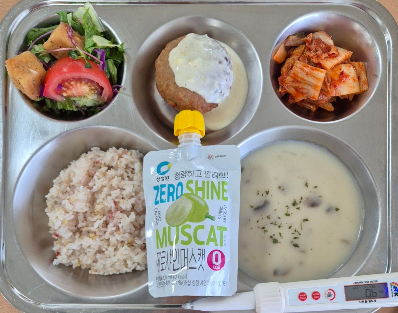 오색발아현미밥양송이스프(2.5.6.16)불닭함박(1.2.5.6.10.12.15.16)토마토두부샐럿(1.5.6.12)배추김치(9)