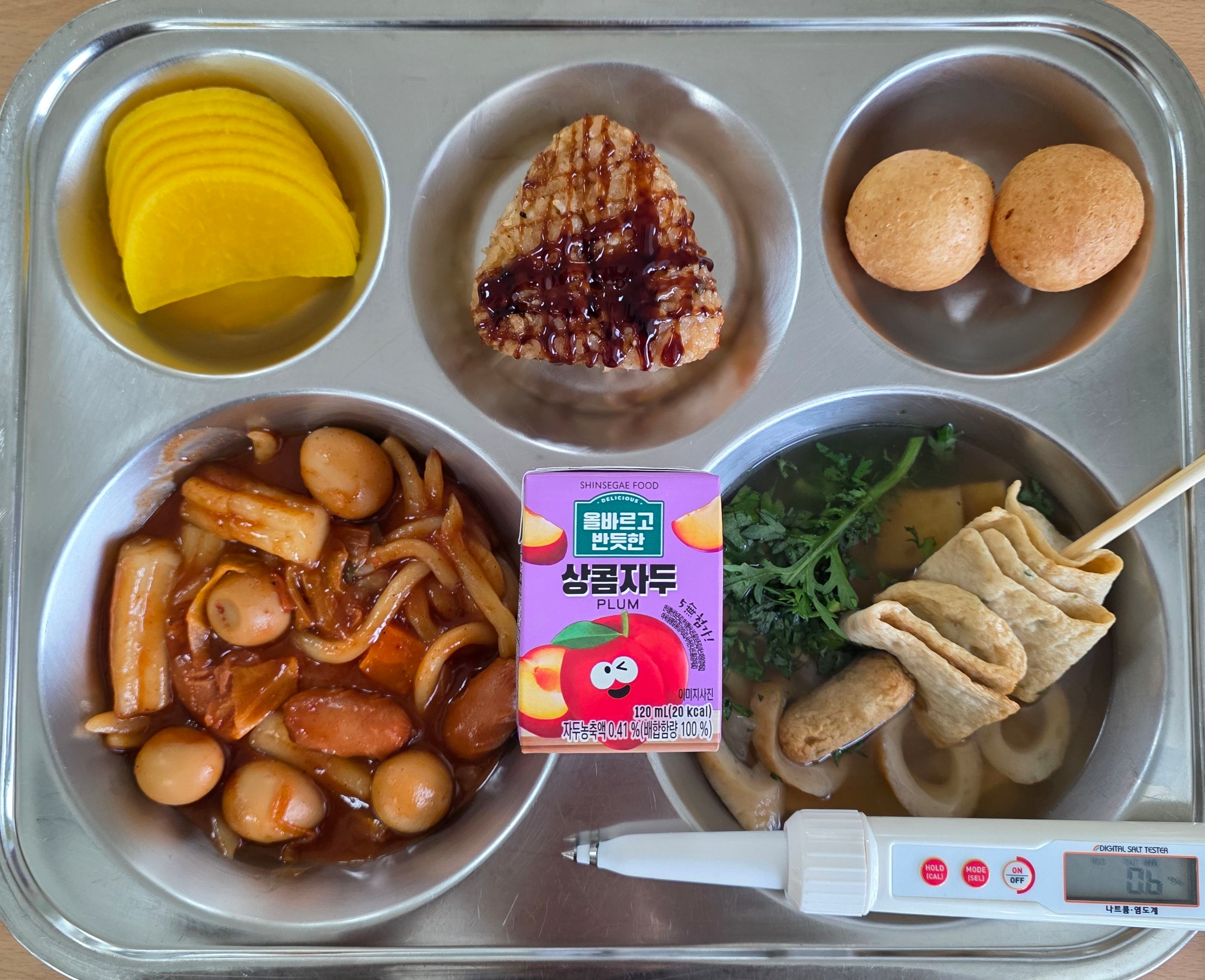 마라떡볶이/치즈볼(1.2.5.6.10.15.16)꼬치어묵국(1.5.6.9)구운주먹밥(1.2.5.6.10.13)단무지자두맛주스* 에너지/단백질/칼슘/철727.6/31.0/191.7/7.0