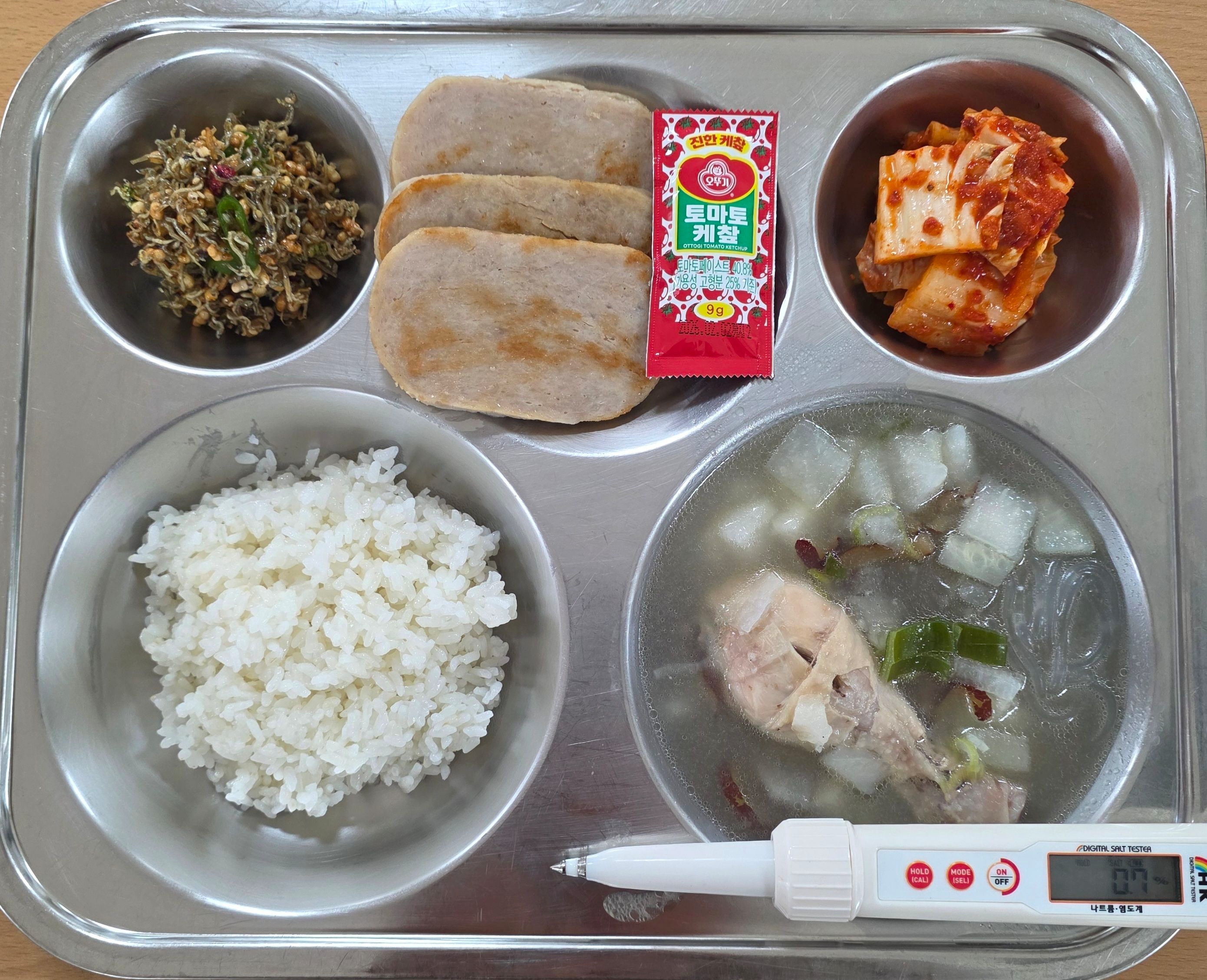 찹쌀밥닭다리곰탕(15)스팸햄구이(1.2.5.6.10.12.13.15.16)뮤즐리멸치볶음(5.6)배추김치(9)* 에너지/단백질/칼슘/철710.1/32.9/120.7/2.2