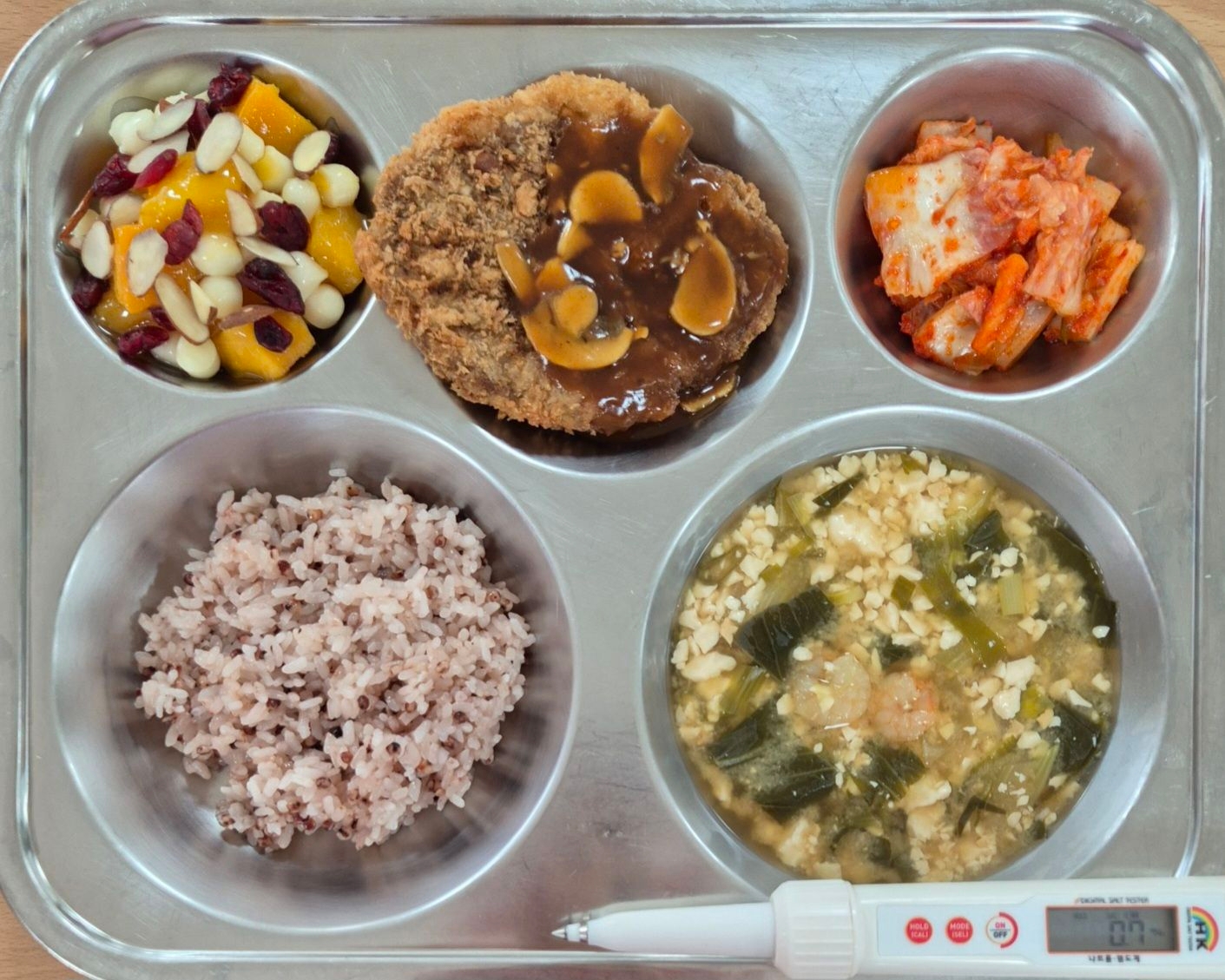 차수수밥연두부청경채새우국(5.6.9)비후까스(1.2.5.6.10.12.13.16.18)아이스망고치즈샐럿(2)배추김치(9)* 에너지/단백질/칼슘/철748.6/22.9/215.3/2.2