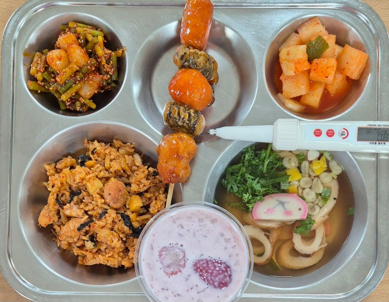 닭갈비야채볶음밥(5.6.9.15.18)가쓰오장국(1.2.5.6.7.9.13.18)모듬꼬치(5.6.12.15)마늘쫑락교무침(5.6.13)깍두기(9)딸기사고(2)* 에너지/단백질/칼슘/철728.4/35.1/227.9/11.6