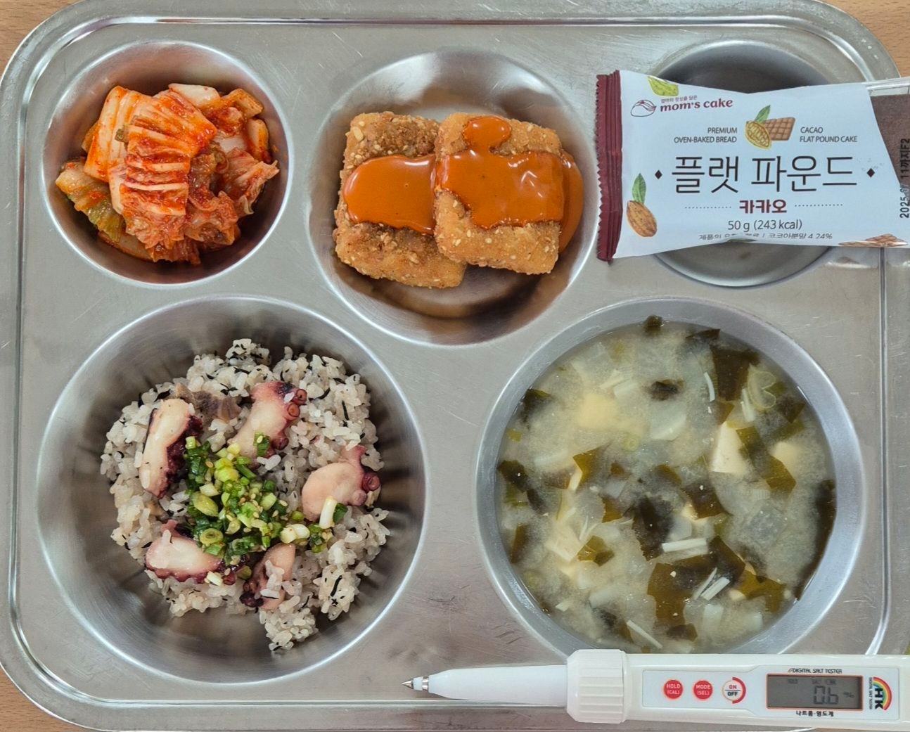 문어솥밥/잔파양념장(5.6)미소장국(5.6.9)두부카츠(1.5.6.12.13)배추김치(9)황치즈파운드케잌(1.2.5.6.14)* 에너지/단백질/칼슘/철720.7/24.9/89.4/1.4