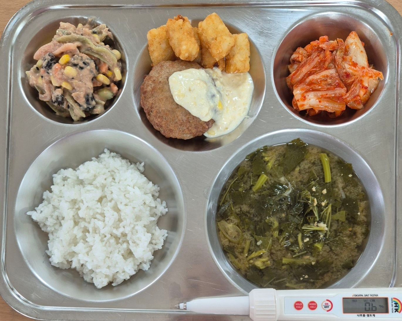 찹쌀밥아욱된장국(5.6.9)불닭함박/맛감자(1.2.5.6.10.12.15.16)푸실리참치샐럿(1.5.6.12.13.16.18)배추김치(9)* 에너지/단백질/칼슘/철744.5/21.6/193.8/1.9