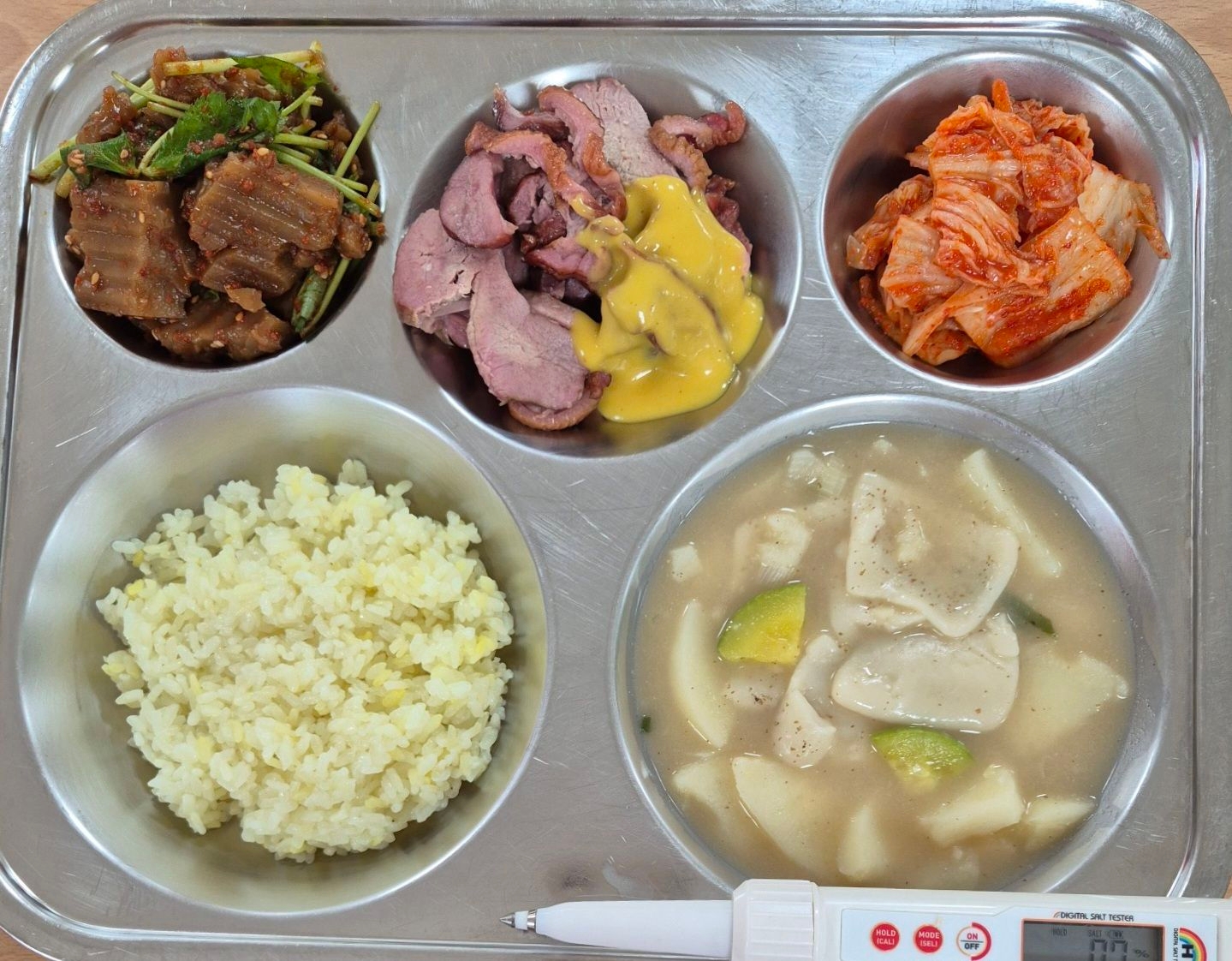 강황쌀밥들깨수제비(5.6.9)오리훈제/소스(1.2.5.6.13)도토리묵참나물무침(5.6)배추김치(9)* 에너지/단백질/칼슘/철716.2/24.6/158.5/1.9