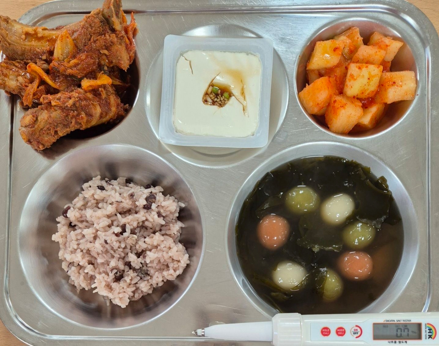 팥찰밥옹심이미역국(5.6.9.17)등갈비김치찜(5.6.9.10.13)연두부/양념장(5.6)깍두기(9)* 에너지/단백질/칼슘/철711.4/33.4/199.7/3.1