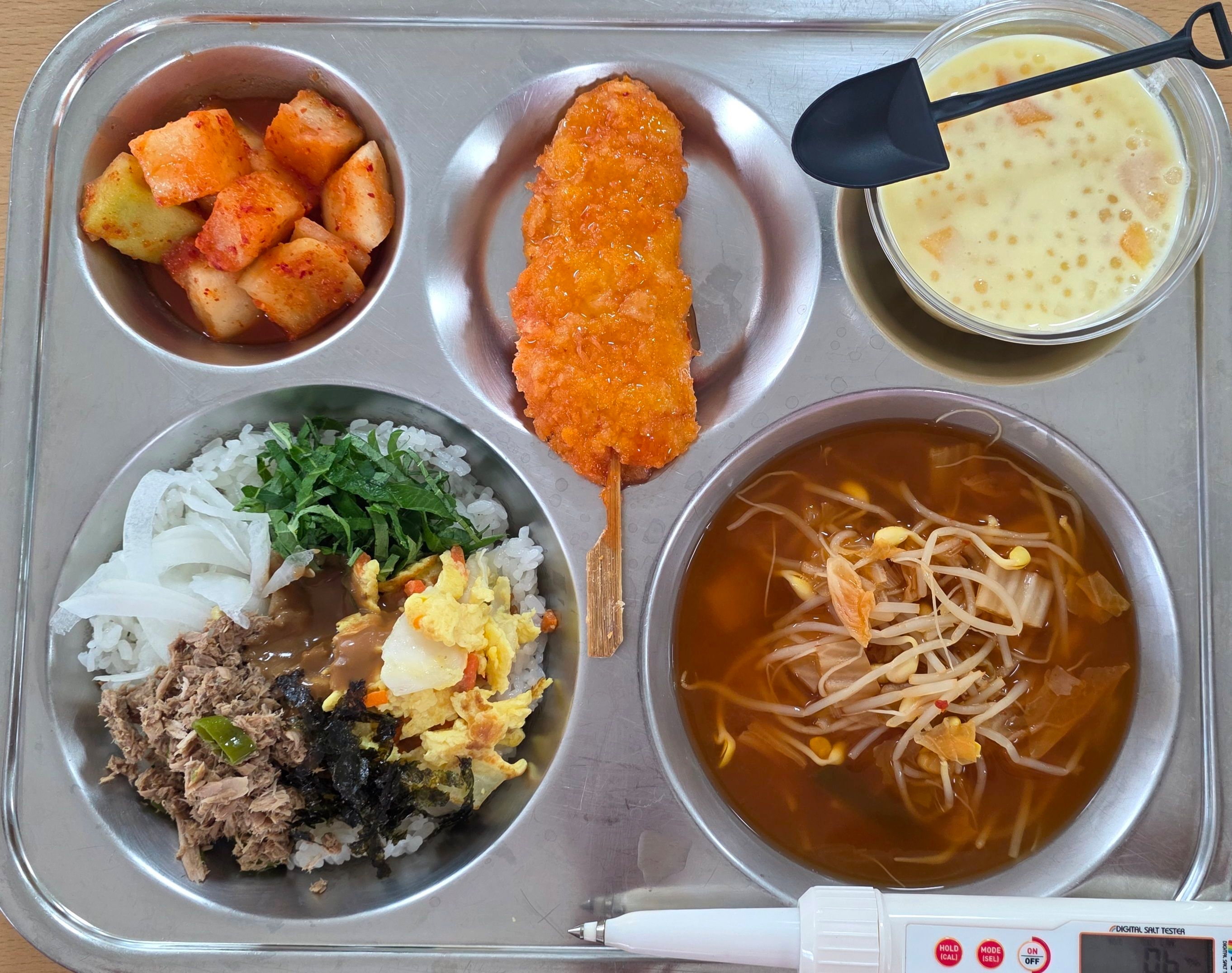 참치마요덮밥(1.5.6.13.16.18)김치콩나물국(5.9)통새우꼬치(1.5.6.9.12.13)깍두기(9)망고사고(2)* 에너지/단백질/칼슘/철728.4/32.5/220.1/2.5
