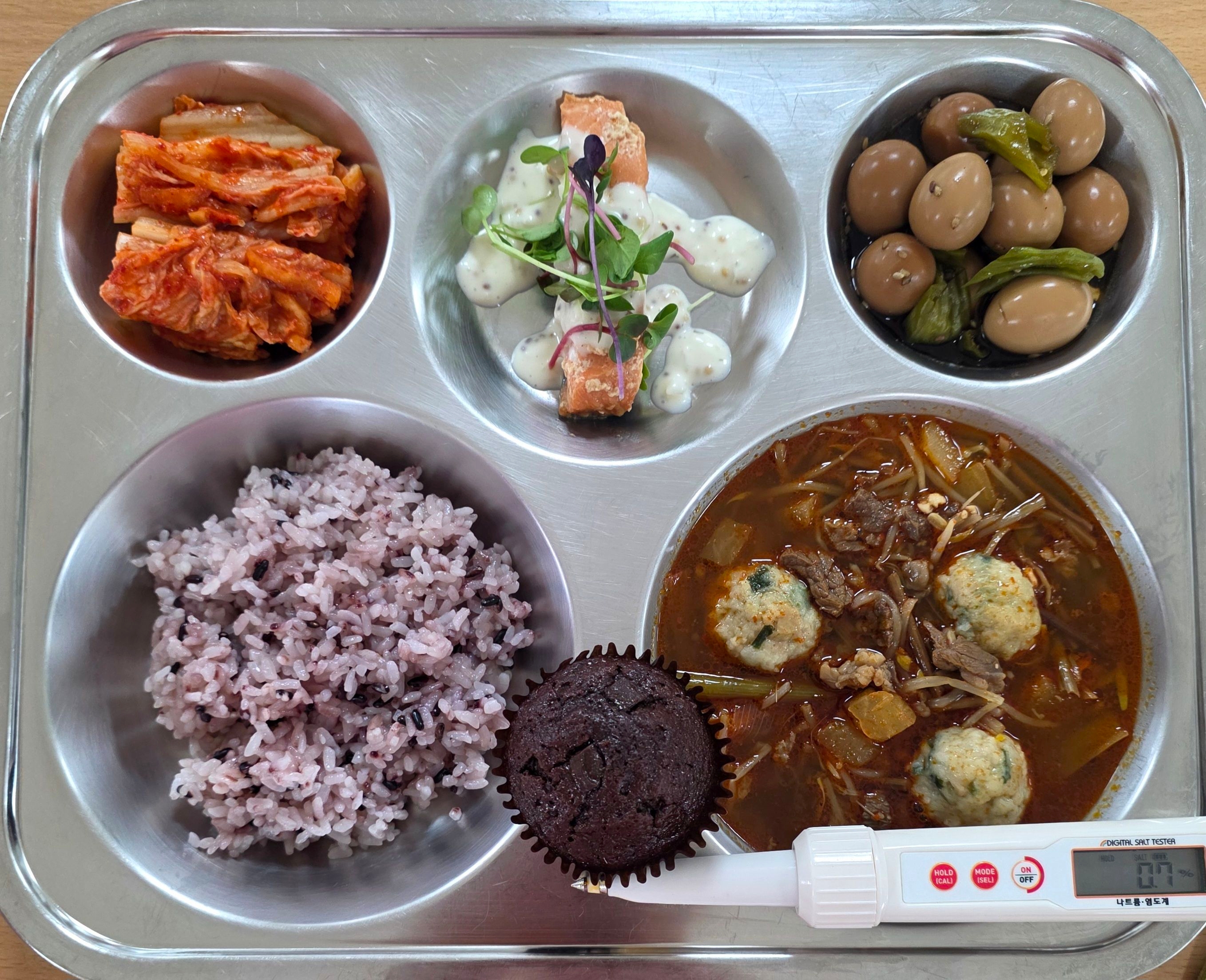 흑미밥만두육개장(1.5.6.10.16.18)연어데리야끼구이(1.2.5.6.13)메추리알조림(1.5.6.13)배추김치(9)초코컵케잌(1.2.5.6)* 에너지/단백질/칼슘/철732.6/30.6/152.9/6.1