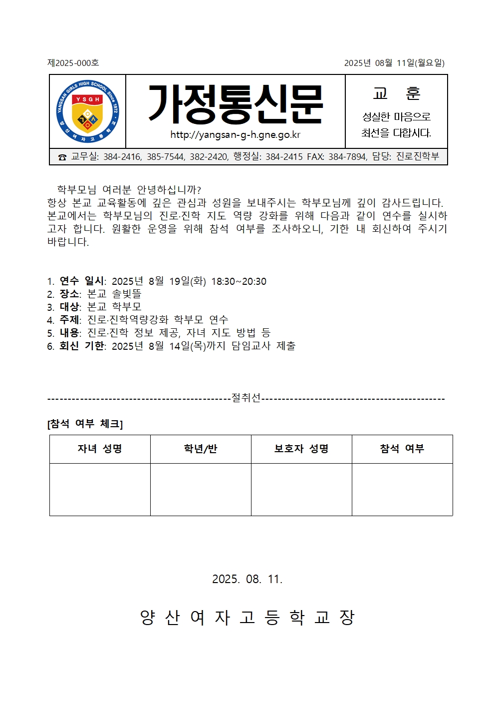 학부모 대상 진로진학 역량강화 연수 가정통신문