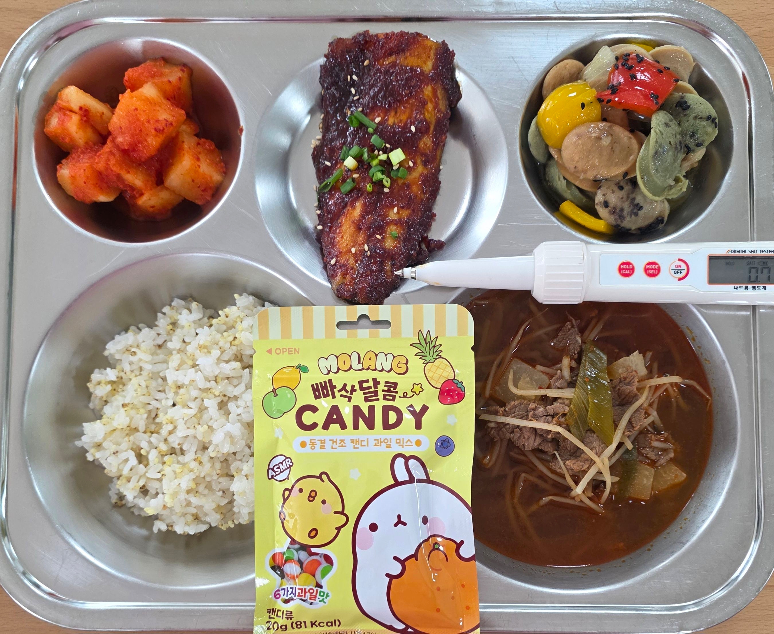 찰기장밥쇠고기국(5.6.16)고갈비구이(7)소시지야채볶음(2.5.6.10.13.15.16)깍두기(9)