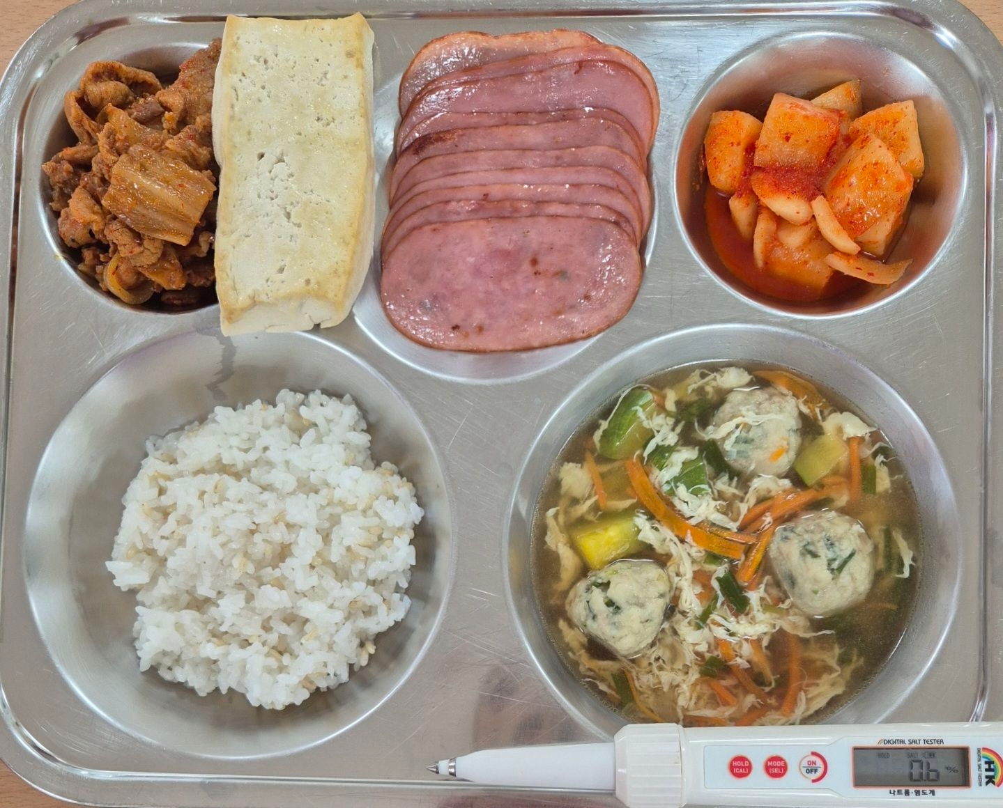 현미밥굴림만두국(1.5.6.9.10.16.18)돈육김치볶음/두부구이(5.6.9.10.13)햄쌈구이(1.2.5.6.10.15.16)깍두기(9)* 에너지/단백질/칼슘/철743.3/38.3/223.4/