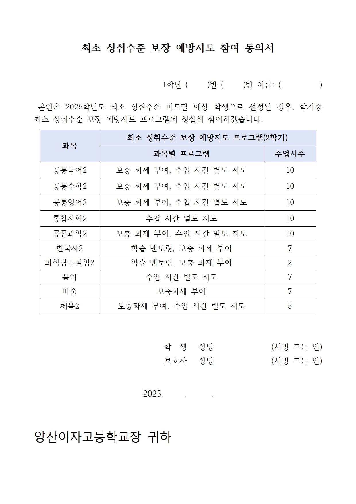 최소 성취수준 보장 예방지도 안내 및 동의서