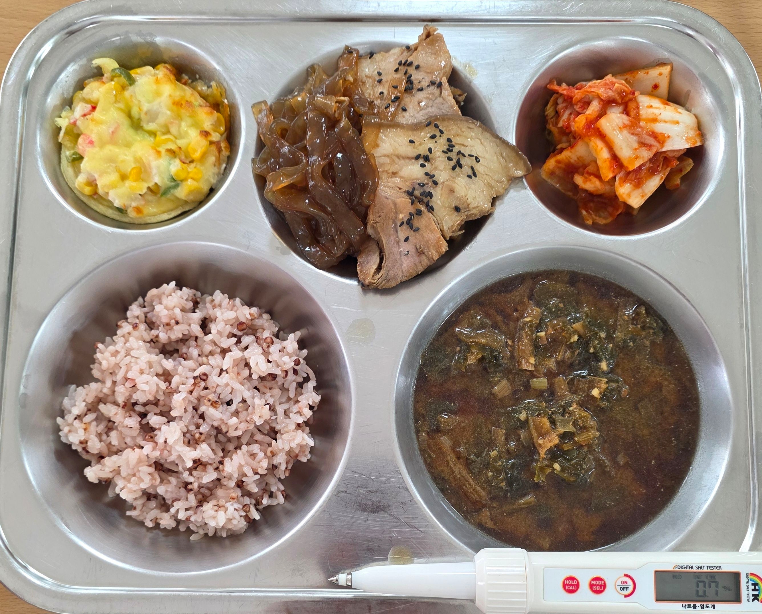 차수수밥무청시락국(5.6.9)당면족발(5.6.10.13.18)콘치즈구이(1.2.5.6.13)배추김치(9)* 에너지/단백질/칼슘/철738.4/40.7/182.9/4.3