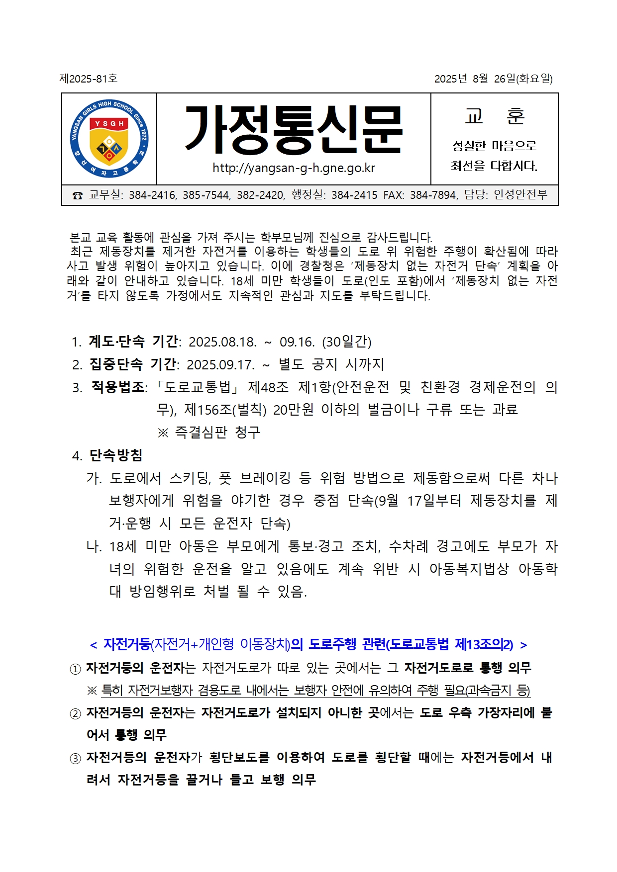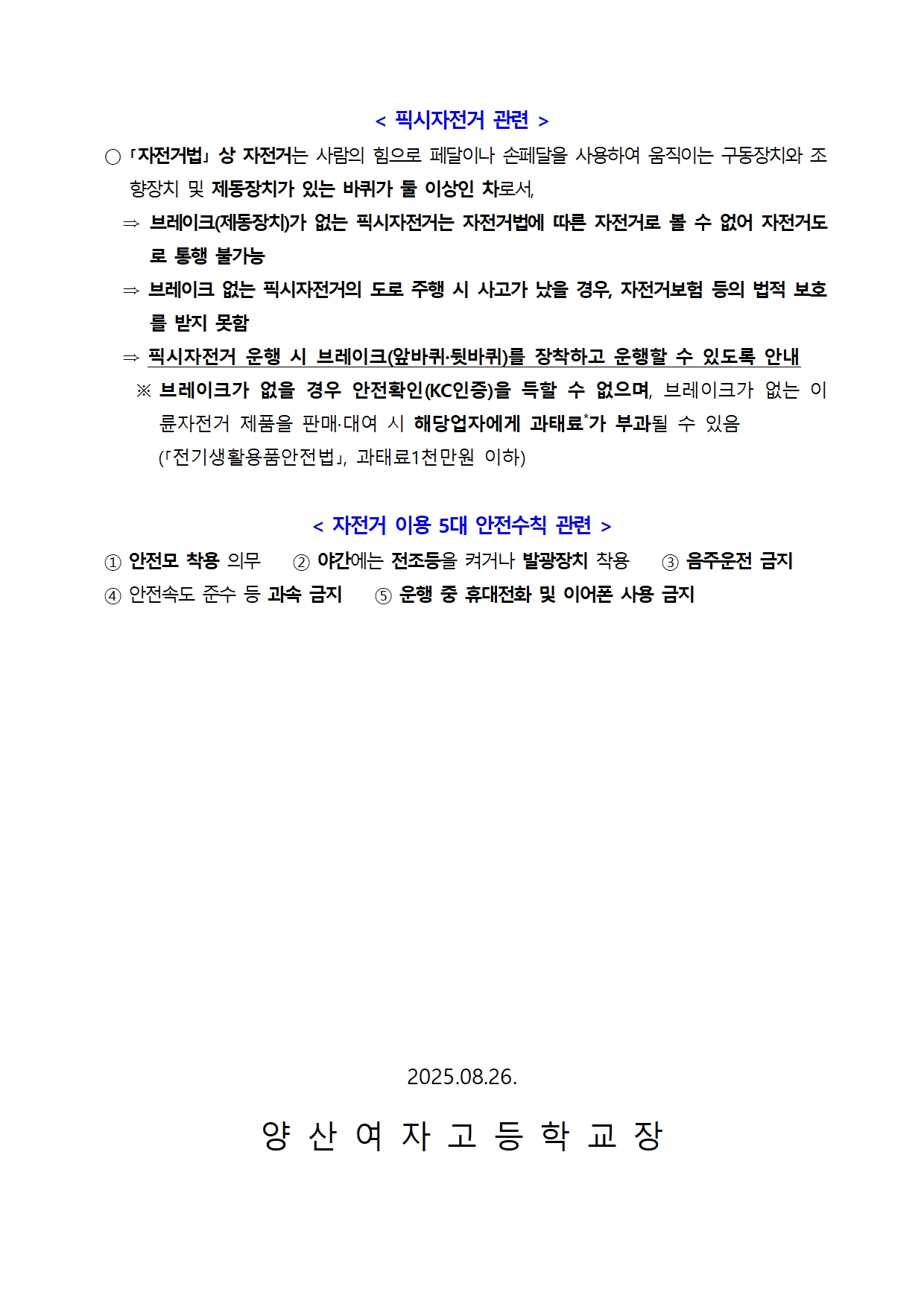 [가정통신문2025-81]자전거 안전교육 강화 및 제동장치 제거 자전거 단속 안내.hwp