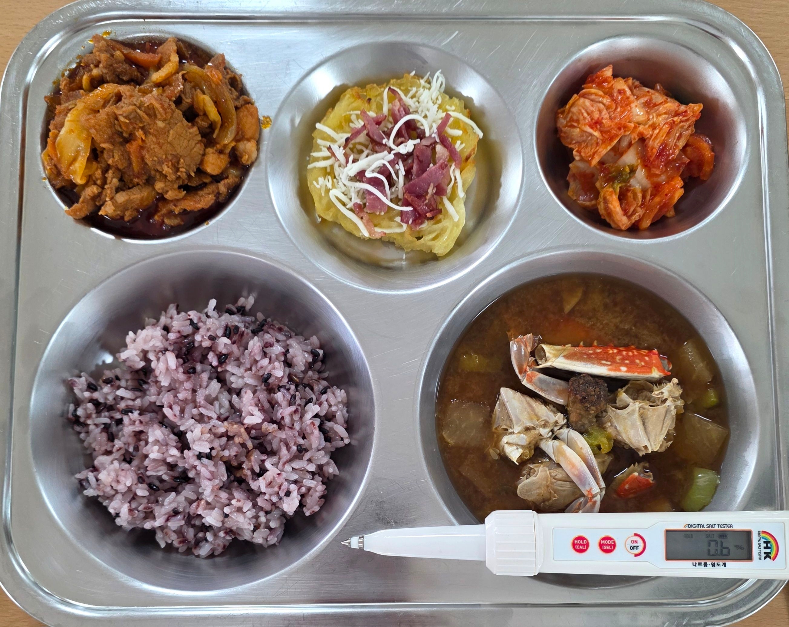 흑미밥꽃게탕(5.6.8.9)고추장불고기(5.6.10.13)치즈베이컨감자채전(2.5.6.10)배추김치(9)* 에너지/단백질/칼슘/철719.1/38.3/162.1/2.3