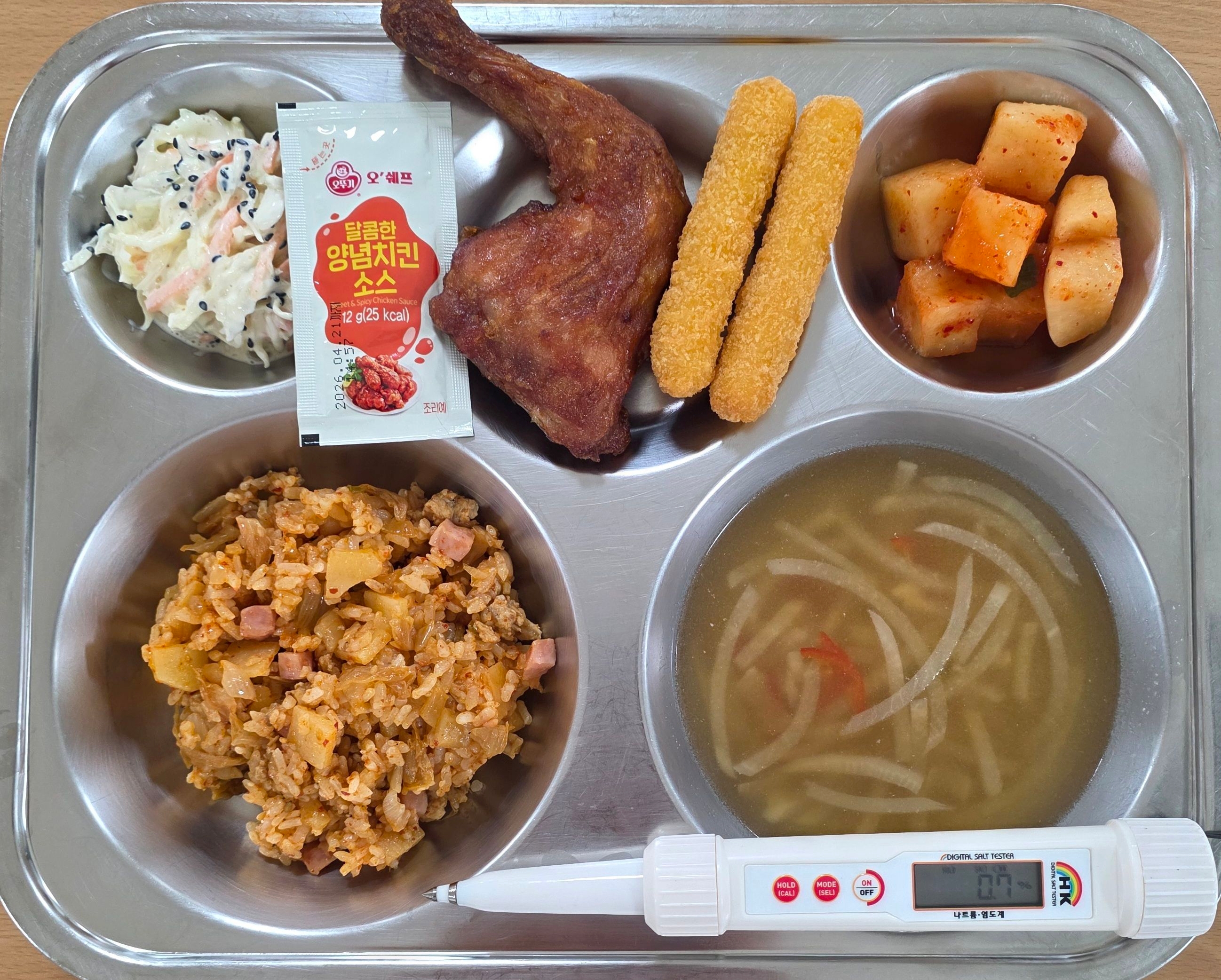 김치볶음밥(1.2.5.6.9.10.15.16)들깨무채국(9)옛날통닭/치즈스틱(1.2.5.6.15)양배추샐럿(1.5.12)깍두기(9)* 에너지/단백질/칼슘/철716.9/34.6/316.1/2.3