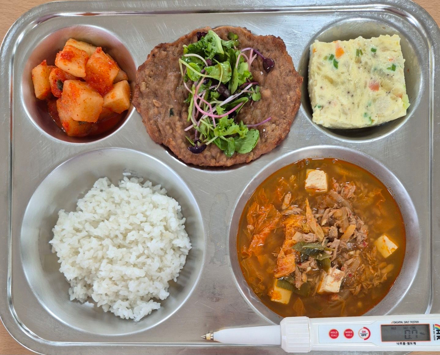 찹쌀밥참치김치찌개(5.9.16.18)언양식떡갈비(1.2.5.6.10.12.15.16)계란야채찜(1.9)깍두기(9)* 에너지/단백질/칼슘/철731.0/29.3/183.5/3.5