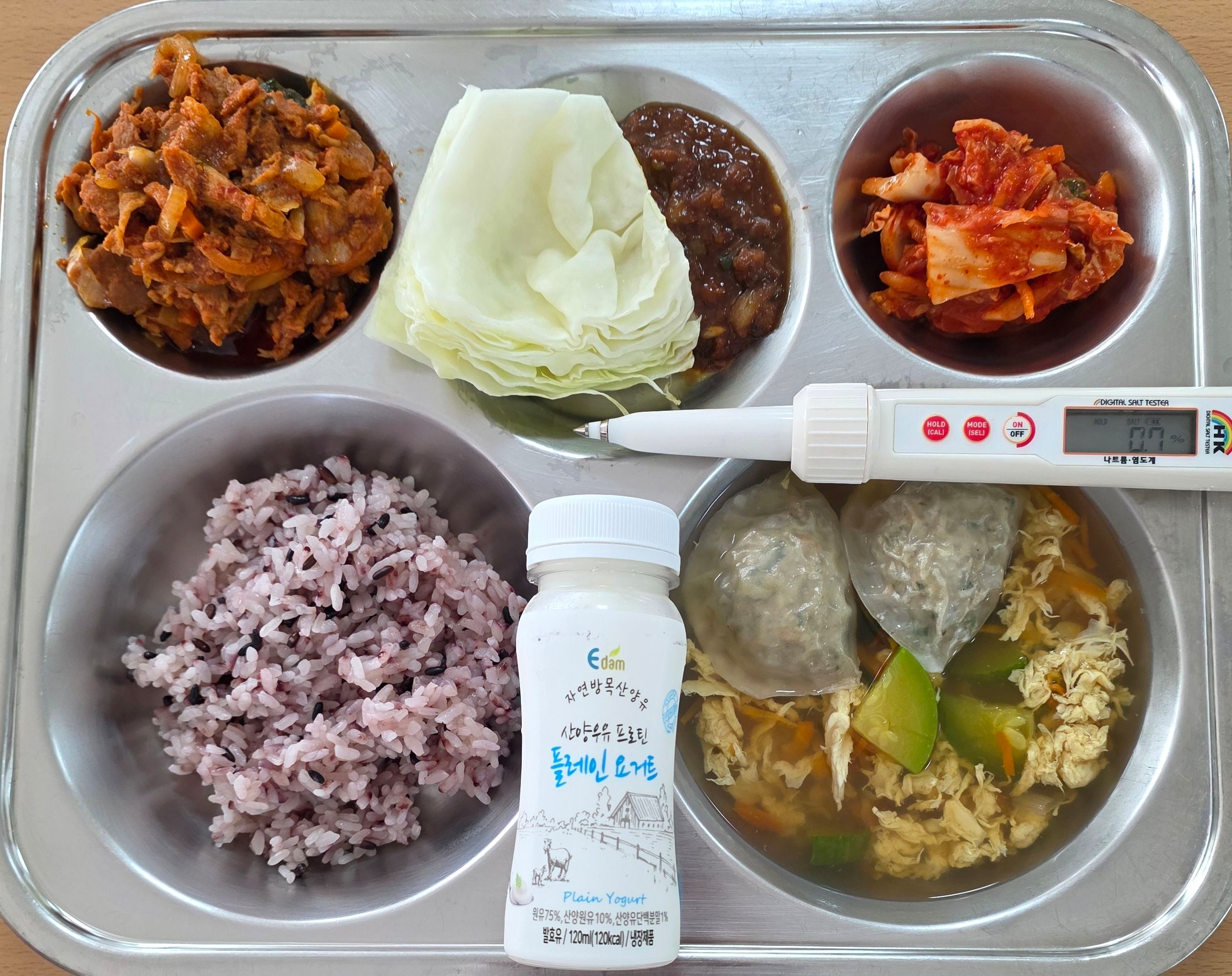 흑미밥고기만두국(1.5.6.9.10.16.18)고추장불고기(10.13)양배추쌈/참치쌈장(5.6)배추김치(9)산양유요거트(2)* 에너지/단백질/칼슘/철749.9/43.0/250.3/4.1