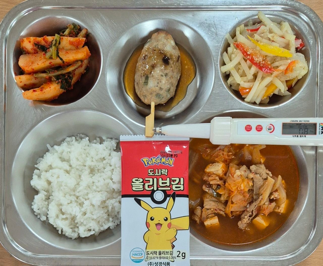 찹쌀밥목살김치찌개(5.9.10)완자꼬치(1.2.5.6.15.16)감자채볶음알타리김치(9)