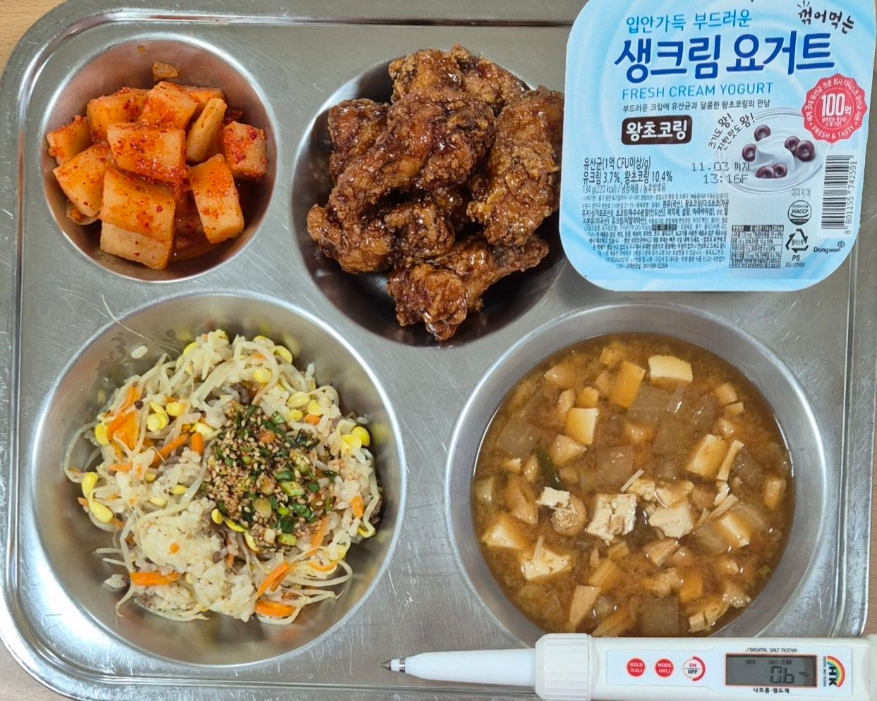 콩나물밥/잔파양념장(5.6.16)유부장국(5.6.9)갈비맛윙봉구이(15)깍두기(9)초코링요거트(2)* 에너지/단백질/칼슘/철727.6/38.1/381.9/3.3