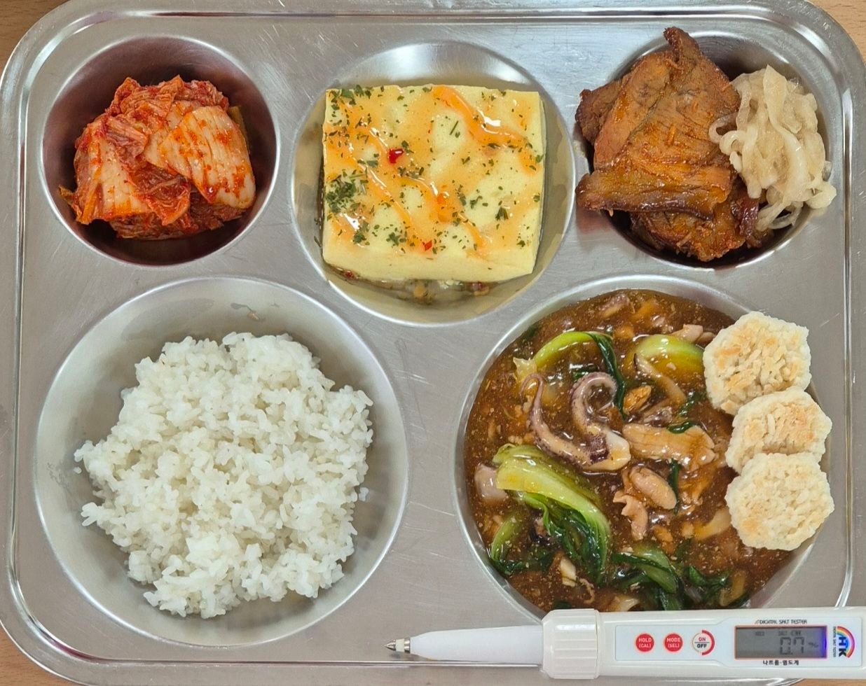 찹쌀밥해물누룽지탕(5.6.8.9.10.17.18)불족발/양파채절임(5.6.10.13)치즈계란찜(1.2.5.6.9.12.13)배추김치(9)* 에너지/단백질/칼슘/철718.6/52.5/93.9/3.1