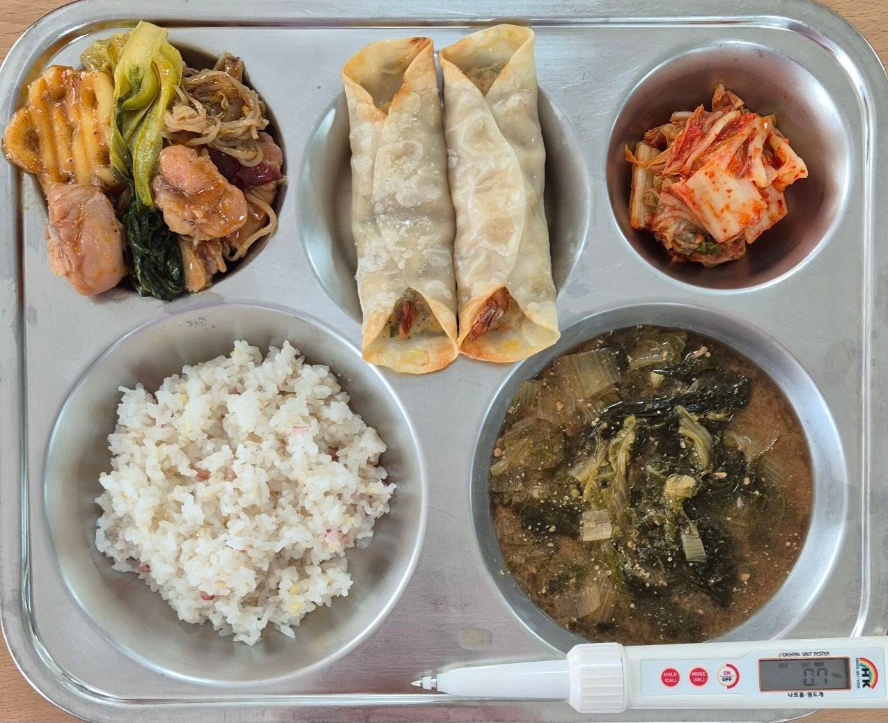 오색발아현미밥단배추된장국(5.6.9)마라찜닭(15)통새우만두(1.5.6.9.10.15.16.17.18)배추김치(9)* 에너지/단백질/칼슘/철718.2/30.4/134.4/1.9