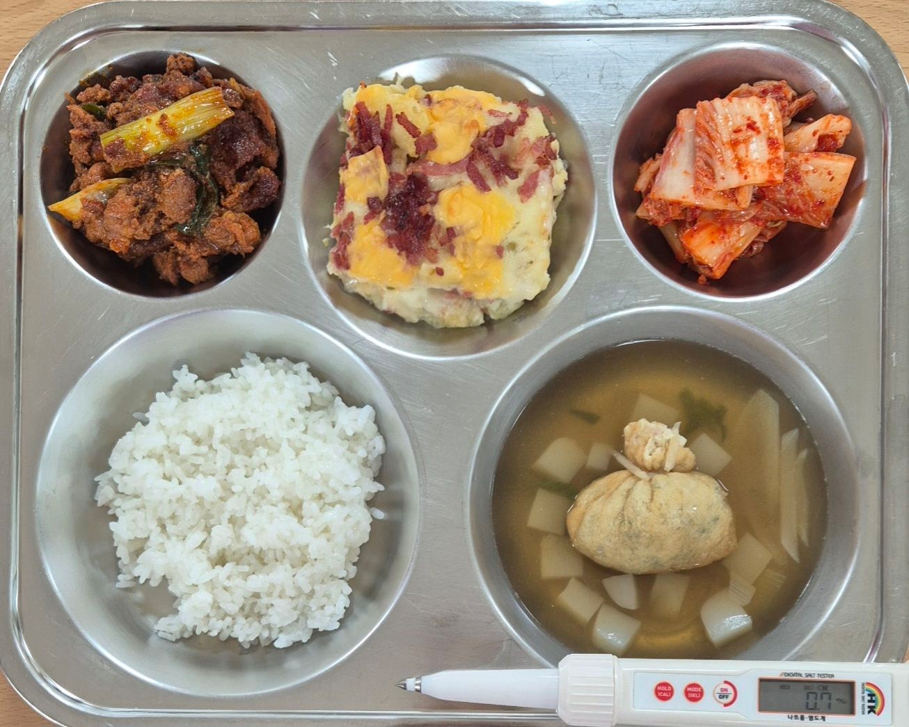 찹쌀밥유부보쌈곤약국(1.5.6.9.10.13.16)돈육대파구이(10)오지치즈후라이(2.5.6.10.13)배추김치(9)* 에너지/단백질/칼슘/철725.58/43.75/235.87/2.22