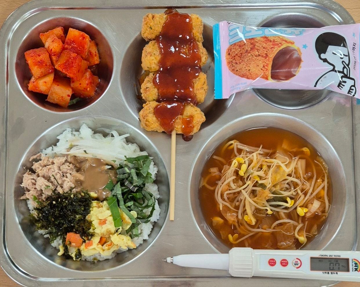 *석식 참치마요덮밥(1.5.6.13.16.18) 김치콩나물국(5.9) 후라이드닭꼬치(2.5.6.12.13) 깍두기(9) 초코크로칸슈(1.2.5.6) * 에너지/단백질/칼슘/철 747.92/26.39/172.80/2.70