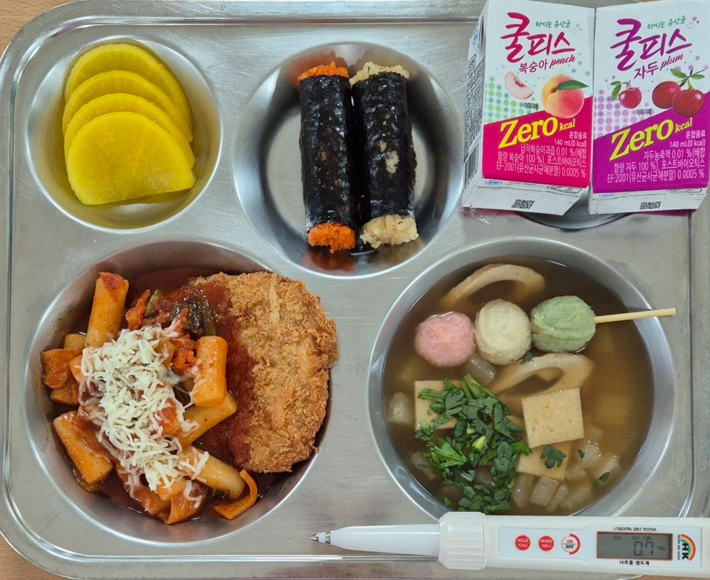 꼬마김밥(1.2.5.6.10)삼색꼬치어묵국(1.5.6.9)돈가스떡볶이(1.2.5.6.10.13)단무지제로쿨피스(11.13)* 에너지/단백질/칼슘/철750.34/24.18/203.53/8.72