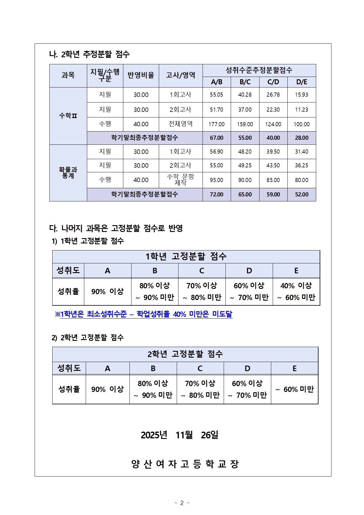 2025학년도 2학기 2회고사 및 학기말 분할 점수 안내