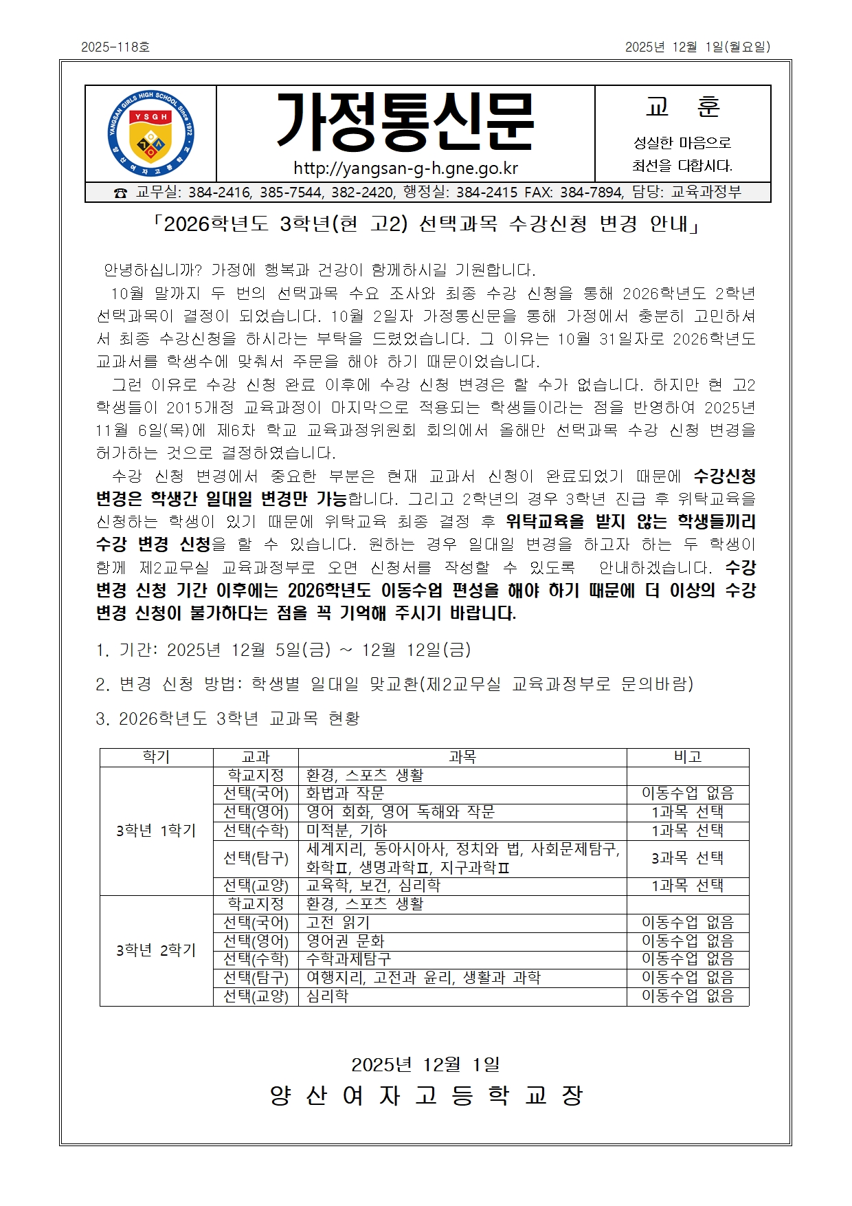 [가정통신문2025-118] 2026학년도 3학년(현 고2) 선택과목 수강신청 변경 안내.hwp