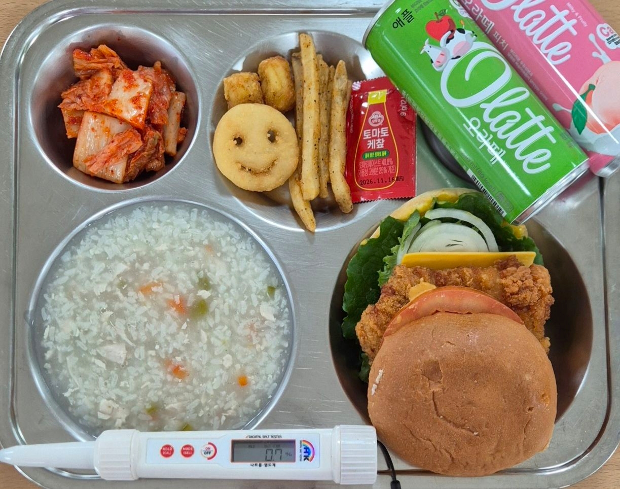 닭영양죽(15)배추김치(9)사이버거(1.2.5.6.12.13.15.18)모듬감자튀김(5.6.12)골라먹는주스(오라떼)(2.13)* 에너지/단백질/칼슘/철727.14/29.67/188.37/2.24