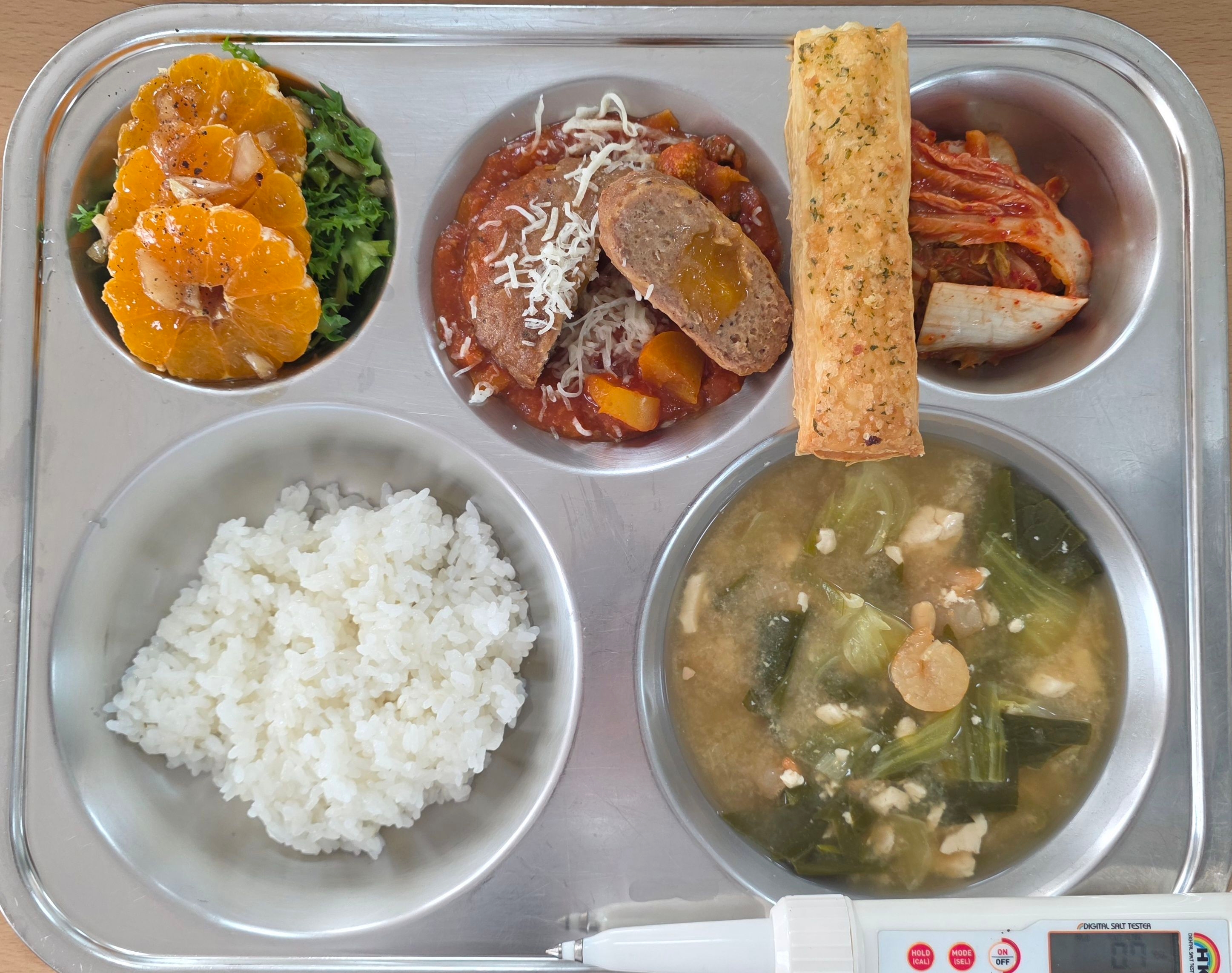 찹쌀밥연두부청경채새우국(5.6.9)에그함박/토마토소스(1.2.5.6.10.12.15.16)감귤치커리샐럿(5.6)배추김치(9)