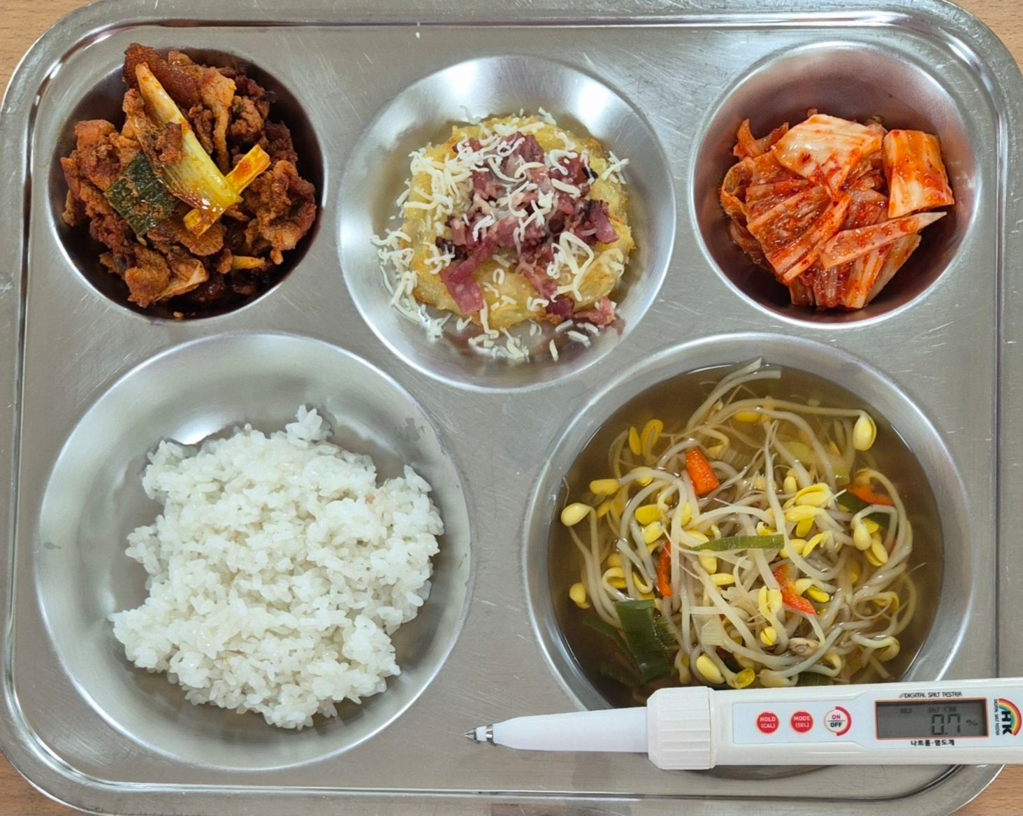 찹쌀밥홍초콩나물국(5.9)돈육대파구이(10)치즈베이컨감자채전(2.5.6.10)배추김치(9)* 에너지/단백질/칼슘/철713.05/41.91/155.39/2.35