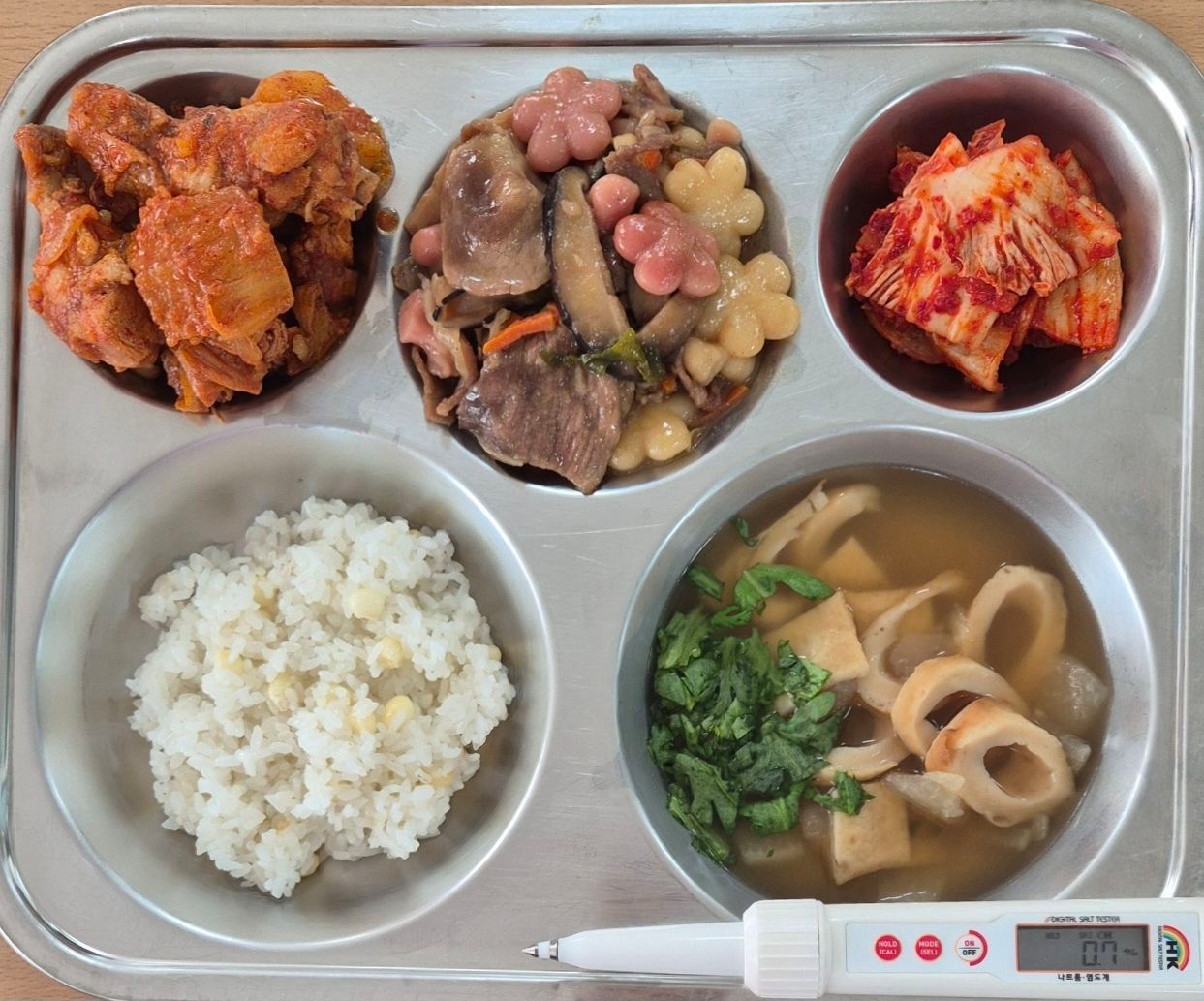찰옥수수밥어묵국(1.5.6.9)묵은지찜닭(5.6.13.15)간장불고기떡볶이(1.5.6.10.15)배추김치(9)* 에너지/단백질/칼슘/철705.35/33.97/83.20/2.02