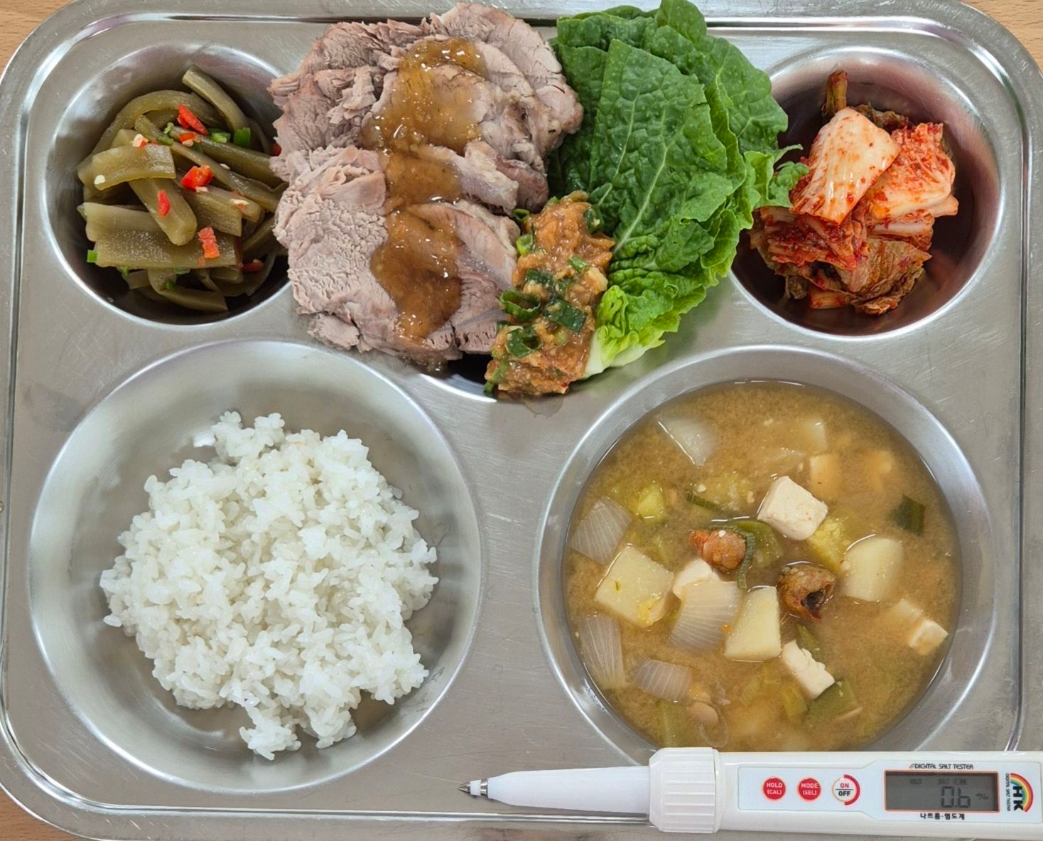 찹쌀밥미더덕된장국(5.6.9)돈사태수육/마늘소스(5.6.10)쌈추/저염쌈장(4.5.6)궁채장아찌배추김치(9)* 에너지/단백질/칼슘/철723.94/48.08/176.01/4.36